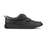 Taking its lead from the natural shape of the foot, this style from Clarks enhances movement – making it perfect for school days. The sports-inspired design is combined with heel and toe protection to guard against scuffs, whilst the sole is flexible and lightweight. The result? All-day protection and comfort. This shoe is finished with a hygienic lining that keeps feet fresh and odour-free all day long. Available in whole and half sizes and different widths. Upper Material Leather. Lining Material Textile. Sole Material Rubber. Fastening Type Riptape