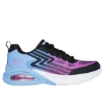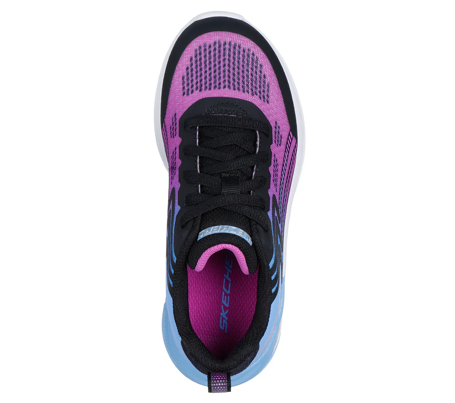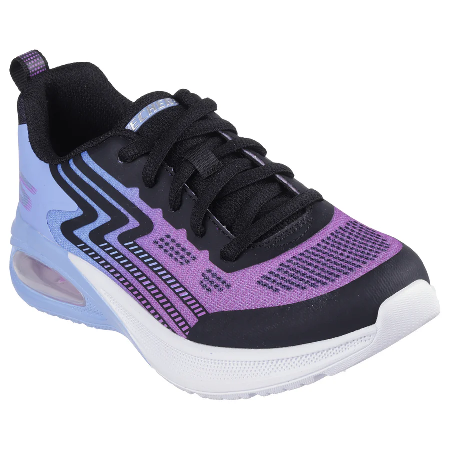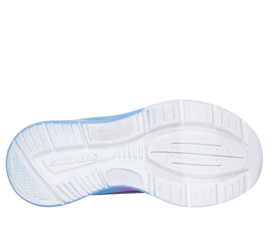 The Skechers 303617L Girls Trainer-Periwinkle combines mesh textile uppers with synthetic overlays for added support. Its stylish blue and purple ombre design with black accents and bubble heel make it a perfect choice for active girls. This trainer is fastened with laces for a secure fit and features a cushioned footbed lined with textile.