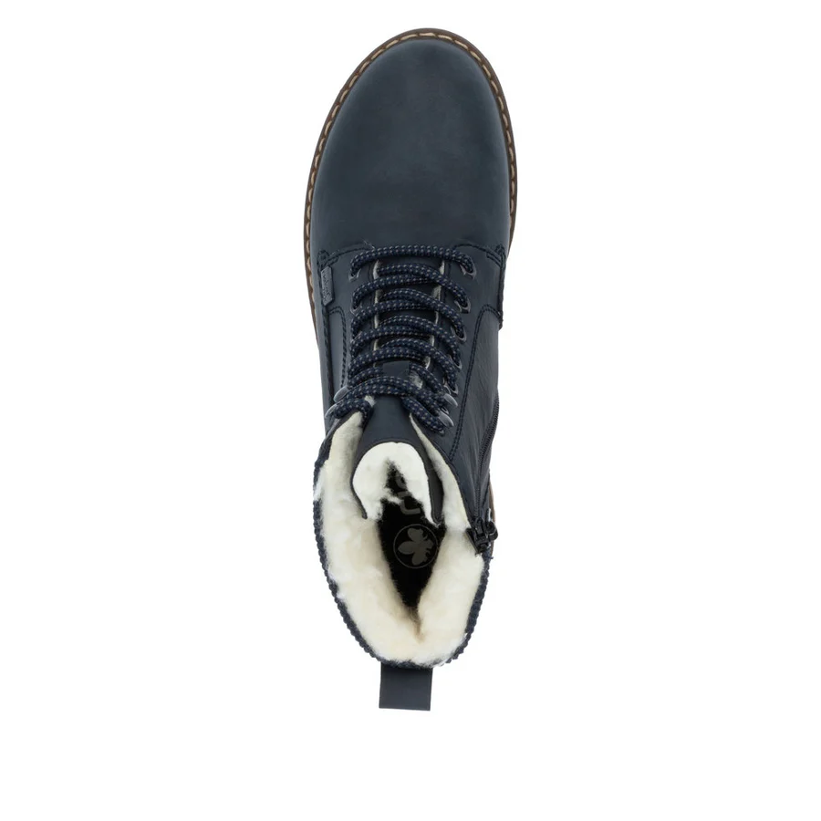 Experience happy feet with these dark blue Rieker lace-up boots. Featuring a classic design, stitchdown construction, and high comfort, these boots are robust, flexible, and provide the perfect fit. The clever combination of lacing and zipper ensures optimal support, while the grippy sole prevents slipping. The water-repellent surface keeps feet dry in wet and cold weather, and the warm lining provides protection against the cold. Step out with confidence on even the coldest days.