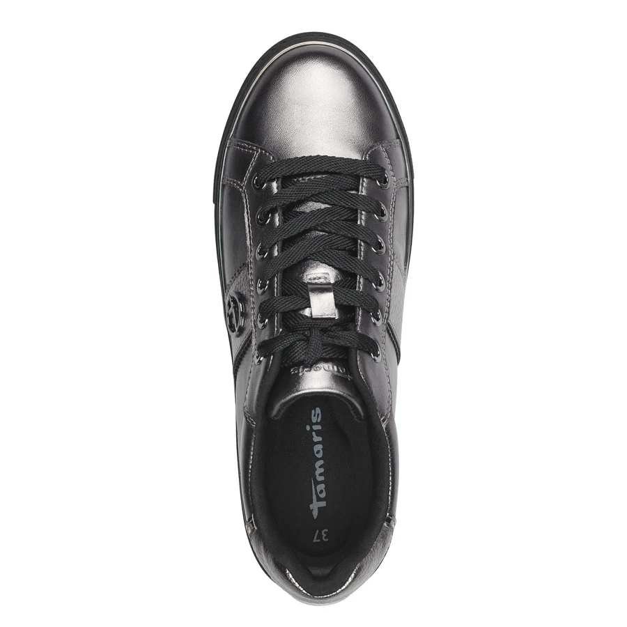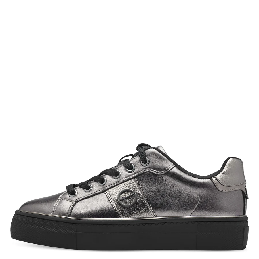 Introducing the Tamaris 23724 Trainers in pewter metallic, fit for the modern woman. This comfortable sneaker boasts a 2.5 cm platform and 6.5 cm shaft for easy wear. The luxurious leather and synthetic materials provide a stylish look, while the round toe and lacing ensures maximum comfort. Complete with COMFORT-Lining and Removable Sock-Technology for a truly indulgent experience. Elevate your style with Tamaris.